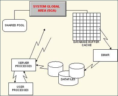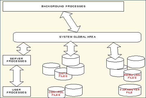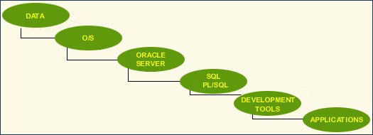 The figure below shows the flow of data through the operating system into the Oracle server and how the database language of SQL/PL/SQL converts them with development tools into information read through the robust applications.
