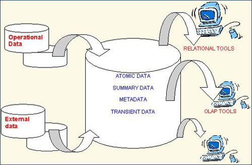 The warehouse server sits in the center of a datawarehouse called the enterprisewide model. All data is loaded into the central warehouse database. End users can access data through this centralized data store. The advantage is that data is stored in one place and reliability of data is increased.