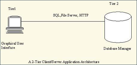 The graphical user interface resides on the client's desktop and the database management services are provided by a powerful server. The application logic is buried in the user interface or within the server using stored procedures and triggers. Two tiered applications include email, simple Web pages, data entry applications etc. It's a good solution when the work group is small. This architecture is called fat client due to a large chunk of application running on the client side. These systems are unable to adapt to growing user activity, data volume and changes in business logic. Popular vendor proprietary software implementations include Sybase/PowerBuilder and MSSQLServer/Visual Basic.