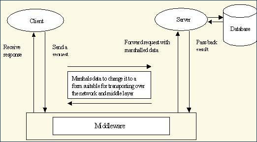 The middle tier can be implemented in a variety of ways depending on the application requirements. Examples of a middle tier include Application Servers, Transaction Processing Monitors(TPM), Message Oriented middleware(MOM), Object Request Brokers(ORB) and Distributed/Collaborative Servers.CORBA from Object Management Group(OMG) and DCOM from Microsoft are the popular object oriented technologies used. Remote Method Invocation is another Object Oriented approach, but it is an all Java solution where the client and the server have to be Java objects. MOM focuses on intelligent messages and provides good solutions for wireless infrastructures.